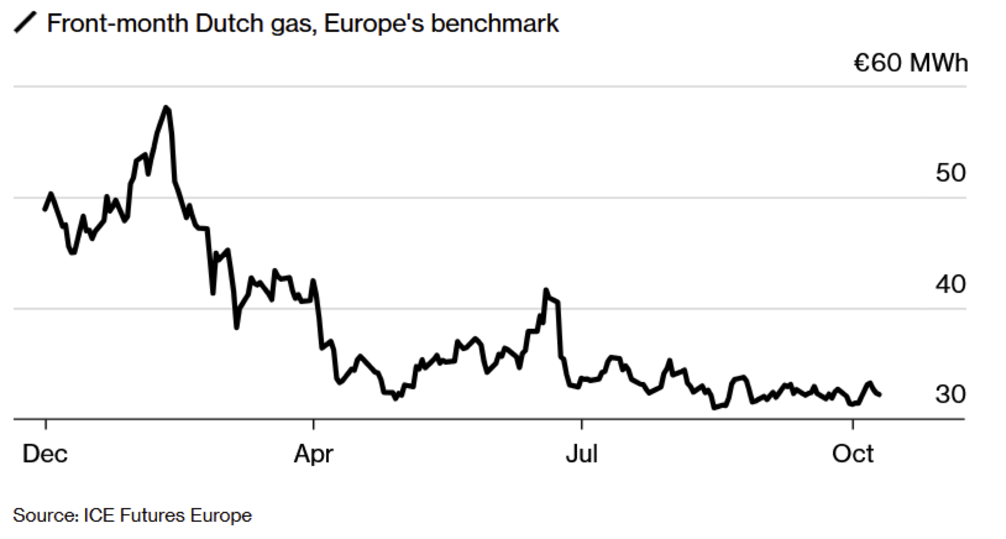 Die Erdgaspreise am TTF sind wieder in den Bereich zurückgekehrt, in dem sie wochenlang gehandelt wurden – siehe nachstehend eingefügte, von ICE Futures Europe entnommene, Grafik. Nachdem die Preise Anfang der Woche kurzzeitig gestiegen sind, sind diese an drei Tagen in Folge gesunken. Ein relativ früher Kälteeinbruch hat den Heizbedarf in Teilen der EU erhöht und einige Wettermodelle sagen in den kommenden Tagen unterdurchschnittliche Temperaturen voraus.