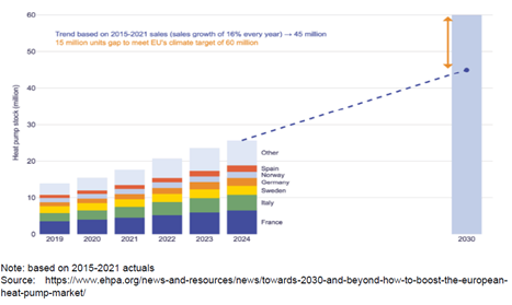 - Die Wärmepumpeninstallation entwickelt sich nicht wie geplant siehe folgende Grafik „Potential heat pump stock growth scenario in Europe (millions)“ und die daraus ersichtliche Installationslücke zum Planwert.