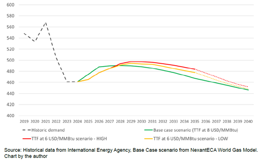 Aufgrund der angenommenen, sehr realistischen, Rahmenbedingungen könnte sich folgende kurz- und langfristige (2040) Erdgasnachfrage ergeben – so die Analysen von OIES. Ebenfalls ist das Basisszenario mit einem Erdgaspreis von eher > 30 €/MWh abgebildet. Anmerkung: die Y-Achse startet nicht bei 0 sondern 400 bcm.